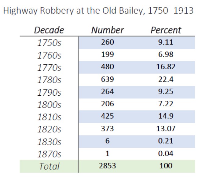 [6] There were over 40 highway robberies prosecuted annually in the years 1826–1828, but only 12 in 1829. Old Bailey Proceedings Online (www.oldbaileyonline.org, version 8.0, March 2018), tabulating decade where offence category is highway robbery, after January 1750. Counting by offence.