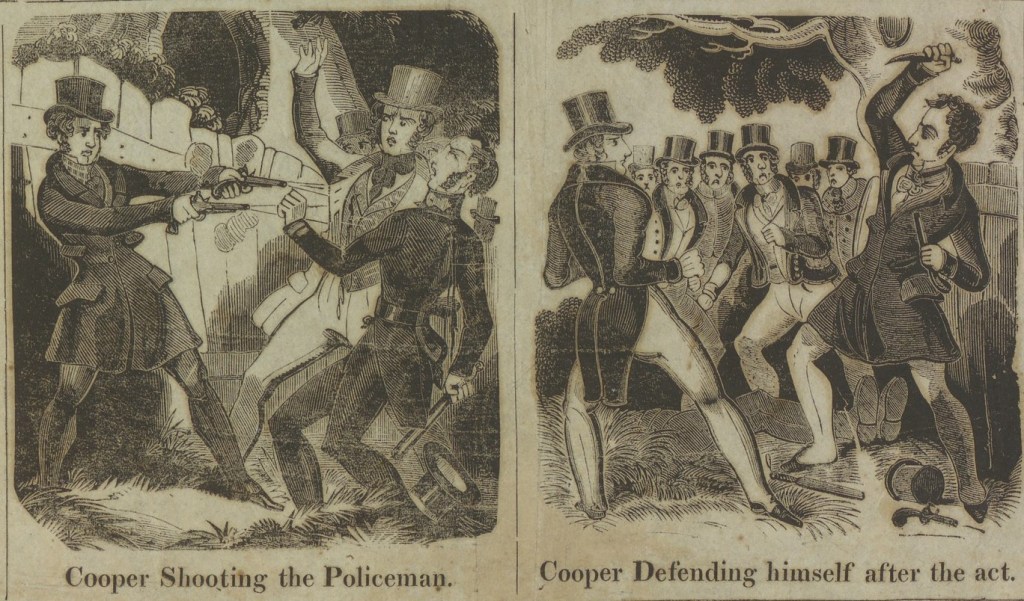 Main image: “Cooper shooting the policeman”, Trial of Cooper for the Murder of Timothy Daly, at Highbury (published by E. Lloyd, 1842). Harvard Law School Library, Historical & Special Collections, Trials Broadside 589, CC BY 4.0.
