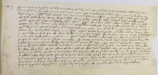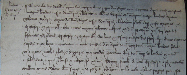 We are on surer footing in considering the process by which the homicides were handled. When a homicide occurred within the ordinary jurisdiction of a county, one of the county’s four coroners (appointed by the crown) was summoned to convene an inquest.[13] As liberty jurisdictions were independent from the counties in which they were situated, however, they had their own coroners, also appointed by the crown in collaboration with the governor of the liberty. In the first three decades of the sixteenth century the coroner for the abbot of Westminster’s liberty (which was quite extensive, including much of the territory between London and Westminster as well as St. Martin le Grand) was a well-known lawyer named Thomas Roberts or Robertz.[14] Roberts was an attorney and clerk (filazer) at King’s Bench; he served as coroner for all six of these cases and many others besides, as one of his many gigs as a lawyer. He was presumably either on retainer or received a fee for each inquest. Notably, Roberts also served as coroner for the county of Middlesex.[15] In other words, whether an unnatural death occurred within the abbot’s liberty or in Middlesex proper, Roberts was summoned, although he did so by virtue of separate appointments (and presumably he billed different offices). The paperwork was similar, although where most coroner’s inquest reports indicated the name of the county on the upper left, in the case of a liberty the coroner indicated that instead (in these cases, for instance, it says “Sanctuary of St. Martin le Grand,” instead of London or Middlesex).