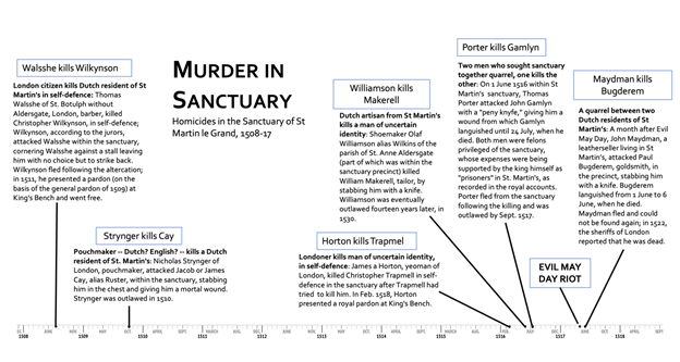 All these homicides were committed within the sanctuary precinct, but the perpetrators could not seek asylum for them at St Martin le Grand as refuge was not available for felonies committed inside sanctuary bounds. On the one hand the heterogeneous nature of the killings makes it unlikely that all six homicides were connected, but on the other it seems equally unlikely that the spate of four killings within sixteen months in 1516-17 were entirely separate quarrels. It is also noteworthy that in the midst of that cluster of homicides the Evil May Day riot of 1517 occurred: not only was Evil May Day the most serious riot in London for decades but the insurrectionists took stranger artisans in general and the precinct of St Martin’s in particular as their target. How the homicides connected to the unrest that led to and followed the riot, however, is simply unknown.