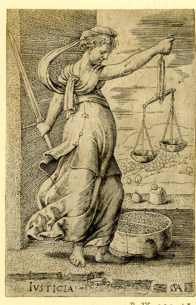 Cornelis Massijs, engraving of Justitia, c. 1550, via the British Museum.