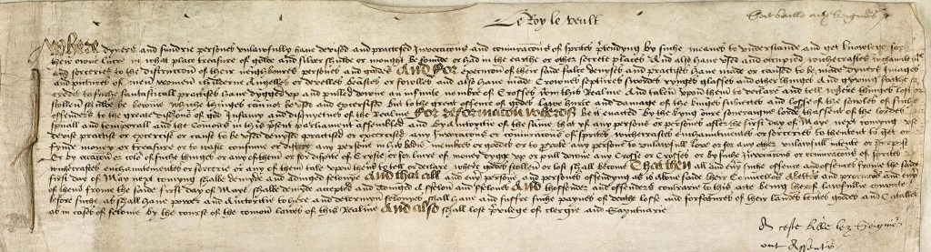 This did not stop the Tudor state taking such practices seriously, however. The very first statute against witchcraft in England, passed under Henry VIII in 1542, recites in the preamble that people had been practicing conjurations in order to โget Knowlege for their own lucre in what place treasure of golde and Silver shulde or mought be founde and had in the earth or other secrete places,โ and made such acts a felony. It was soon repealed in 1547, but revived again in the Elizabethan law of 1563, just as the English witch craze was beginning to take off. Johannes Dillinger has documented these associations across Europe, and their passage into North America, throughout the sixteenth and seventeenth centuries.[11]