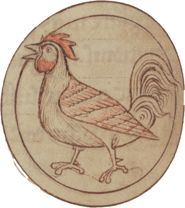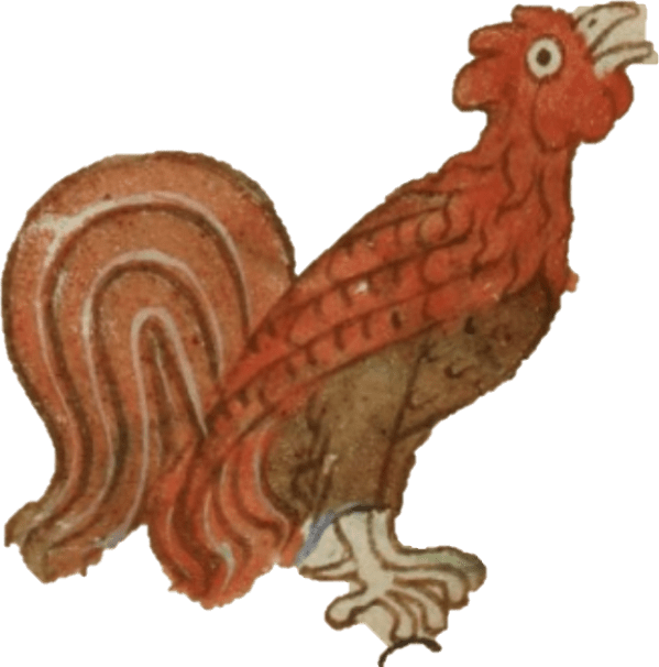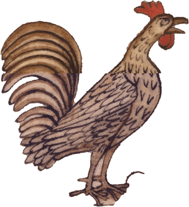 The images of cockerels were found via The Medieval Bestiary, with images from the following manuscripts, used by courtesy of their respective repositories: Bibliothรจque Municipale de Douai, MS 711 (De Natura animalium), folio 36r; British Library, Royal MS 13 B VIII (Topographia Hibernica/Expugnatio Hibernica/Itinerarium Kambriae), folio 19v; and Huntington Library, HM 27523 (Livre des Propriรฉtรฉs des Choses), folio 134r.