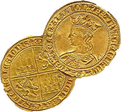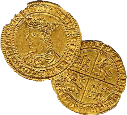 The coins depicted are from a hoard of Castilian gold, dated 1350-69, found in Myddle, Shropshire; the full image is available at finds.org.uk from the Birmingham Museum Trust, shared by a CC-BY attribution license.