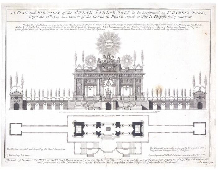 Plan and elevation of the Royal Fireworks, St James’s Palace, Designed by Giovanni Niccolo Servandoni, engraved in London by George Vertue, 1749. Victoria and Albert Museum (public domain).