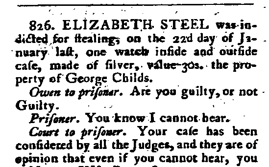 Five days later John Ferriday was indicted for the assault on Robert Ashworth, and this time the lawyers were ready for him. Mr Coltman put forward two arguments for why Ferriday ought to be tried. Firstly, Sir Matthew Hale had ruled that if people could, by means of signs, make themselves “generally intelligible” to a deaf person, then that person could be tried for any offence with which they were charged. Then, he cited the precedent set by the case of Elizabeth Steel, a 20-year-old deaf woman convicted at the Old Bailey in 1787 and sentenced to seven years’ transportation. She was deaf only, but the jury found she stood mute by the visitation of God.[13] However, the Twelve Judges had agreed that this was not sufficient to prevent her being tried, ruling that if she could not understand her arraignment, the clerk could enter a plea of not guilty.