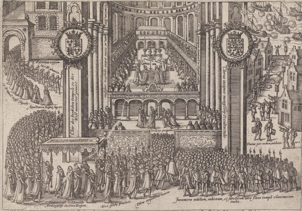 A 1603 engraving of the coronation of King James VI as King of England, unknown artist, via Wikimedia Commons.