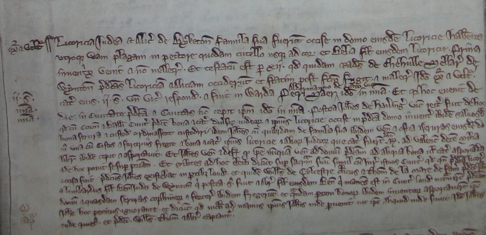 Licoricia Judea & Alicia de Byketon famula sua fuerunt occise in domo eiusdem Licoricia habentes utroque unam plagam in pectore quodam cultello usque ad cor et Belia filia eiusdem Licoricie prima inventrix venit et non malecreditur. Et testatum est per xij. quod quidam Radulphus de Chehulle sellarius de Wyntonia predictas Licoriciam & Aliciam occiderunt et statim post factum fugit et malecreditur. Ideo exigatur et utlagetur. Catalla eius ij solidi unde vicecomes responderit et fuit in warda Petri Saer Aldermanni de Alto Vico ideo in misericordia. Et quia hoc evenit de die in civitate predicta et civitas non cepit ipsum ideo in misericordia. Postea Johannes de Haveringe vicecomes rectatus fuit de hoc quod cum coronator & ballivui civitatis predicte bona et catalla diversorum judeorum et ipsius Licoricie occise in predicta domo inventa ibidem salvos sub bona serura et custodia ordinassent custodiri idem Johannes cum quibusdam de familia sua ibidem venit et ostia & seruras eiusdem domus una cum cistis & forceriis fregit et bona et catalla ipsius Licoricie et aliorum iudeorum que catalla fuerunt domini Regis ad valenciam decem milia librarum ibidem cepit et asportavit Et Johannes venit et defendit quod ipse numquam venit ad domum predictam ad aliqua bona vel catalla asportanda et de hoc ponit se super patriam. Et milites ad hoc electi dicunt super sacramentum suum simul cum juratoribus istius civitatis quod quando predicta Licoricia occisa fuit predictus Johannes existebat in partibus Londonie et quidem Willelmus de Cylcestre clericus et Thomas de la Mare de familia predicti Johannis & Lumbardus filius Benedicti judei de Wyntonia qui postea suspensus fuit et Abraham filius eiusdem Benedicti qui manens est in civitate Londonia intraverunt predictam domum et quasdam seruras cophinorum et forceriorum ibidem fregerunt et quandam partem bonorum ibidem inventorum asportaverunt ipso Johanne hoc penitus ignorante et dicunt quod nichil ad manus ipsius Johannis inde pervenit nec ipse aliquid inde scivit Ideo Johes inde quietus et predicti Willelmus Thomas & Abraham capiantur.