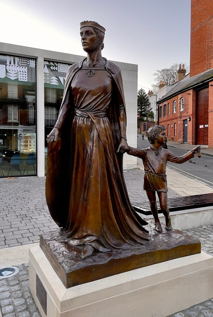Today marks the one-year anniversary of the unveiling of the statue of Licoricia of Winchester (d. 1277), a Jewish moneylender and businesswoman who rose to great success in thirteenth-century England. A widowed mother with at least four, possibly five, children, she drew clients from royalty, nobility, and the church, and traveled extensively for business dealings in Bedford, Hampshire, Norfolk, Oxford, Surrey, Warwick, and Wiltshire. The statue raised in her honor stands outside The Arc on Jewry Street in Winchester, close to the medieval Jewish Quarter. In one hand, she holds a tallage, a demand for taxes imposed by the king upon the Jewish community and symbolic of the extraordinary financial oppression of the Jews by the crown. With the other, she grasps the hand of her young son Asher, who looks distractedly behind him and holds a dreidel. The presence of the young boy in this memorial is a useful reminder that the success of medieval women was accomplished despite having young children to look after while conducting business. Around the base of the statue is engraved a quotation taken from Leviticus 19:18, “Love thy neighbour as thyself,” a reference to the increasingly hostile times in which she lived, leading up to the expulsion of the Jews from England in the year 1290.