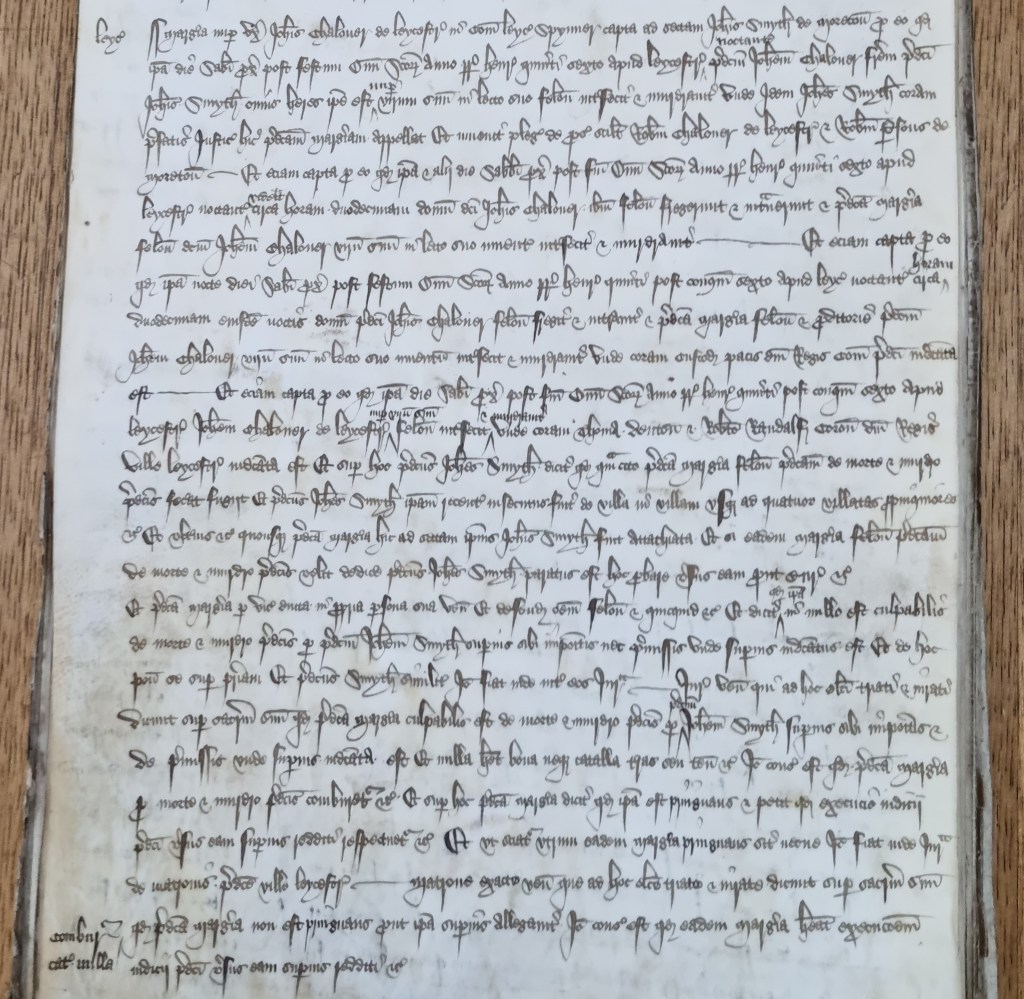 For the early records of the common law, verdicts were recorded in the gaol delivery rolls and files. These rolls include records of pleadings, calendars of prisoners, and copies of commissions. At these sessions, justices from the central law courts could hear local cases relating to a range of criminal activity, from robbery to murder. For the jamboree, JUST 3/195 was on display, an early fifteenth century roll for Derbyshire, Leicestershire, Lincolnshire, Northamptonshire, Nottinghamshire, Rutland, and Warwickshire. The specific case(s) highlighted showed how punishments (and the crime for which a party was accused) could differ depending on the defendant. In the first entry, Margery Chaloner, the wife of John Chaloner of Leicester, accused John Mathewe and Richard Bargeyn of killing her husband in his bed on a Saturday night in November 1418. The record notes that the men were found guilty of this murder and ordered to be hanged.