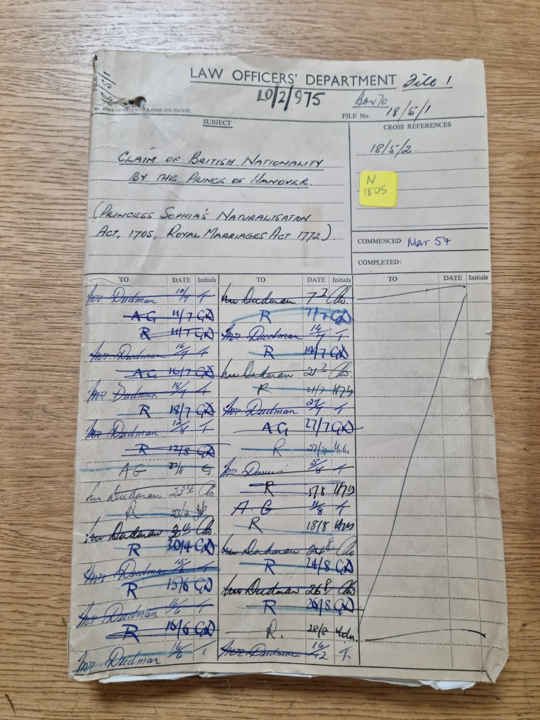 Files of legal opinions can also be found at The National Archives. LO 2/975, which sits within the registered files of the Law Officers Department, contains the 1957 opinion regarding the claim to British nationality of Prince Ernest Augustus of Hanover under Princess Sophia’s Naturalisation Act 1705 and in respect of the Royal Marriages Act 1772. The 1705 Act, which was repealed by the British Nationality Act 1948, granted British citizenship to any Protestant descendant of Princess Sophia, electress of Hanover, and brought them within the line of succession to the British throne. The Royal Marriages Act 1772 provided that descendants of George II could not be married without the consent of the Sovereign.