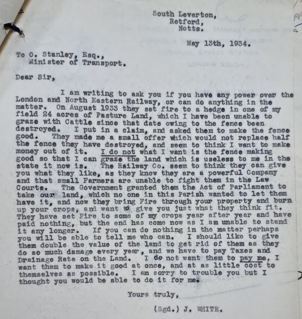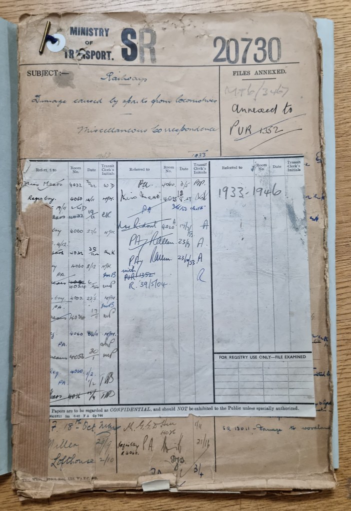 Correspondence to and between government departments can also help us shed light on legal concerns and processes. MT 6/3467 is a file concerning the “railway sparks” cases, damage caused by sparks from locomotives. Dating from the inter-war years and the era of the “Big Four” railway companies, this file contains letters begging for the assistance of the Ministry of Transport in obtaining redress from the railway companies for the losses caused by lineside fires. Such requests were made in the context of an almost off-hand dismissal of such claims by the railways, who had the law very much on their side. The ability of the railway companies to rely on the defence of statutory authority made it incredibly difficult for claimants to recover their losses, and the Railway Fires Act 1905 had done very little to improve their lot. The letters in this file speak to the great frustration and hardship experienced by such individuals, bringing us into intimate contact with the lived experience of the law and the lives of the ordinary people affected by it.