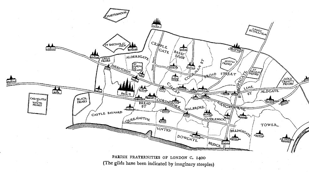“Parish Fraternities of London c.1400,” from George Unwin, The Gilds and Companies of London (London: Methuen & Co., 1908), 120.