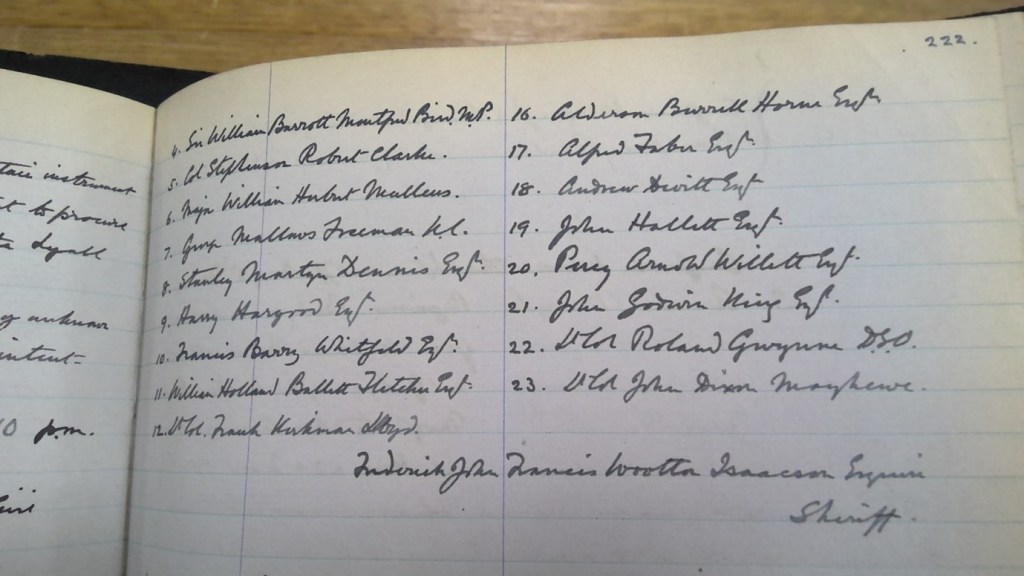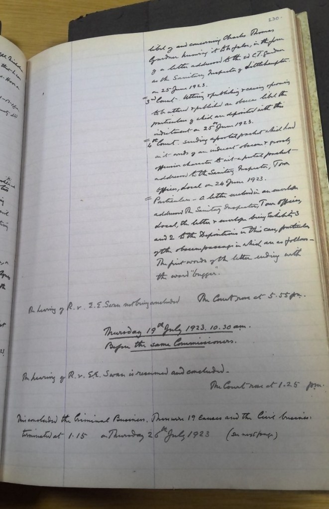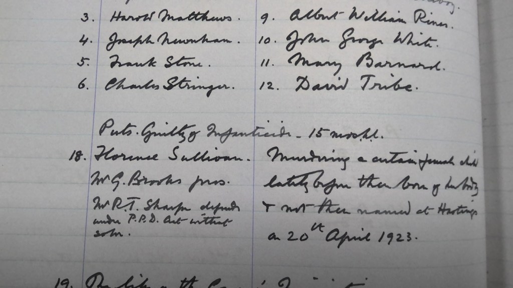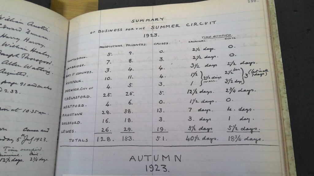 And so, we leave the Lewes Summer Assize of 1923. As we do so, one minute book entry shows us that women’s lives intersected with, and affected, the world of the Assize in ways which we might not always see or consider. We are reminded of this by the discovery of a note that the Clerk of Assize was summoned to London because his wife was in labour, and subsequently that she was delivered of a son. The court rose a little earlier than usual that day, though not, apparently, before the stirring events in London had been brought to a happy conclusion.