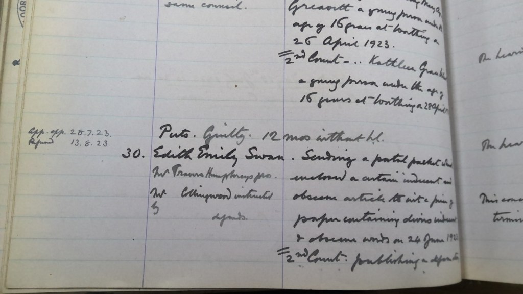 The crown minute book details the charges brought against Edith and the physical evidence submitted against her (which does not survive at The National Archives). It tells us that the case was prosecuted by a Mr Humphreys, and that Edith Swan herself was represented by Mr Collingwood. She was more fortunate, in this respect at least, than the ten defendants whom the minute book tells us were not represented by counsel. Edith was found guilty and sentenced to twelve months in prison without hard labour. She was given leave to appeal her conviction on 28 July 1923, but her appeal was refused on 13 August 1923.