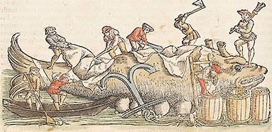 Illustration of whale flensing from Konrad Gesner, Fischbuch, 1598, via Wikimedia Commons.