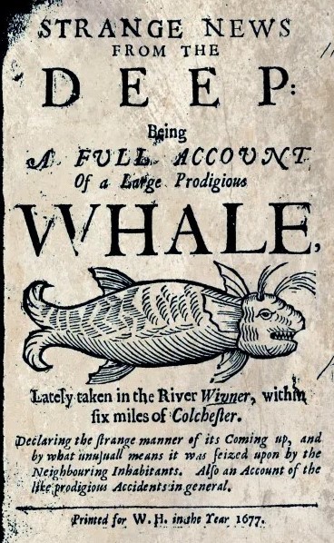 [9] Anon., Strange Newes for England: Being a True and Perfect Relation of the Two Great and Unheard of Wonders Seen in the River of Thames (London, 1659), pp. 3-6. On such prodigies, portents, and providential readings of unusual natural phenomena, see, e.g, Alexandra Walsham, ‘Vox Piscis: or, The Book-Fish: Providence and the Uses of the Reformation Past in Caroline Cambridge’, English Historical Review 114 (1999), 574-606: studying a different ‘piscatorial prodigy,’ Walsham notes that many Protestants, while disdaining ‘miracles’ as superstitious nonetheless regarded the natural world as a ‘hieroglyph of celestial wisdom’ that showed the hand of God, alongside assumptions that ‘the physical environment was morally sensitive and responsive to human fortunes and transgressions, a mirror and cipher of the spiritual sphere’ (577). For an illustrated introduction to prodigy pamphlets focused specifically on whales, see the blog post ‘Wondrous Whales’, Streets of Salem, 12 June 2013.