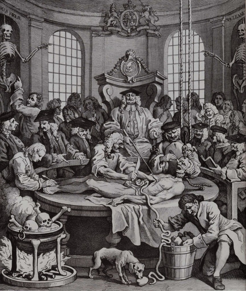 Finally we reach the famous anatomisation scene of Plate 4. I have always been troubled by the dating of this series of prints, for they are inscribed in the plate as “Published according to Act of Parliament Feb. 1. 1751.” The Act in question was the Engraving Copyright Act 1735 which required such information.[8] The celebrated Murder Act of 1752 had not been passed when Hogarth issued the series,[9] and it was this Act which generalised and extended the practice of post-mortem dissection for murderers. Of course the practice had been carried out on a limited basis prior to the Murder Act,[10] but the dating nagged at me. It was not neat. Hogarth may be forceful, but he is usually neat.