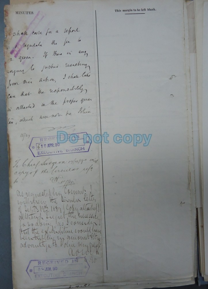 By June Monro’s frustration with the Home Office, Home Secretary and Receiver (the Met Police’s chief financial officer) was clearly visible in the comment noted on this document: “This again does not meet my wants, but I am sick of referring this question back and back again.”[9] MacKellar was instructed to withdraw the order that had been issued in September, and Monro decided that “In any important cases I shall call for a report and regulate the fee to be given. If there is any inquiry to justice resulting from this action, I shall take care that the responsibility is attached in the proper quarter, which will not be Police.”[10] MacKellar was unhappy about this (“the expenditure would have been trifling in amount and the advantage to Police very great”),[11] and Monro resigned on 18 July 1890; but it was they who had the last word.