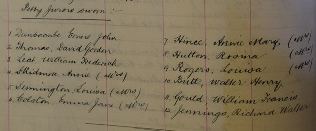 Early work of mine looked at the electoral registers of a handful of English cities, and found that the women of the jury pool consistently made up only about 5% of the population of people who were, technically, women, but who were overwhelmingly excluded from this new, legally bounded, aspect of women’s citizenship.[5] And if a dozen women were plucked out of that 5% and called upon to serve, well then what was so special about them?