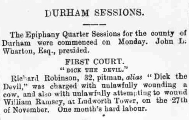 The press reported no cases of wrongdoing by anyone nicknamed Dick the Devil until the late 1870s, when coal miner Richard Robinson was sentenced to one month’s hard labour at the Durham quarter sessions, for wounding a cow and attempting to wound a man.[15]