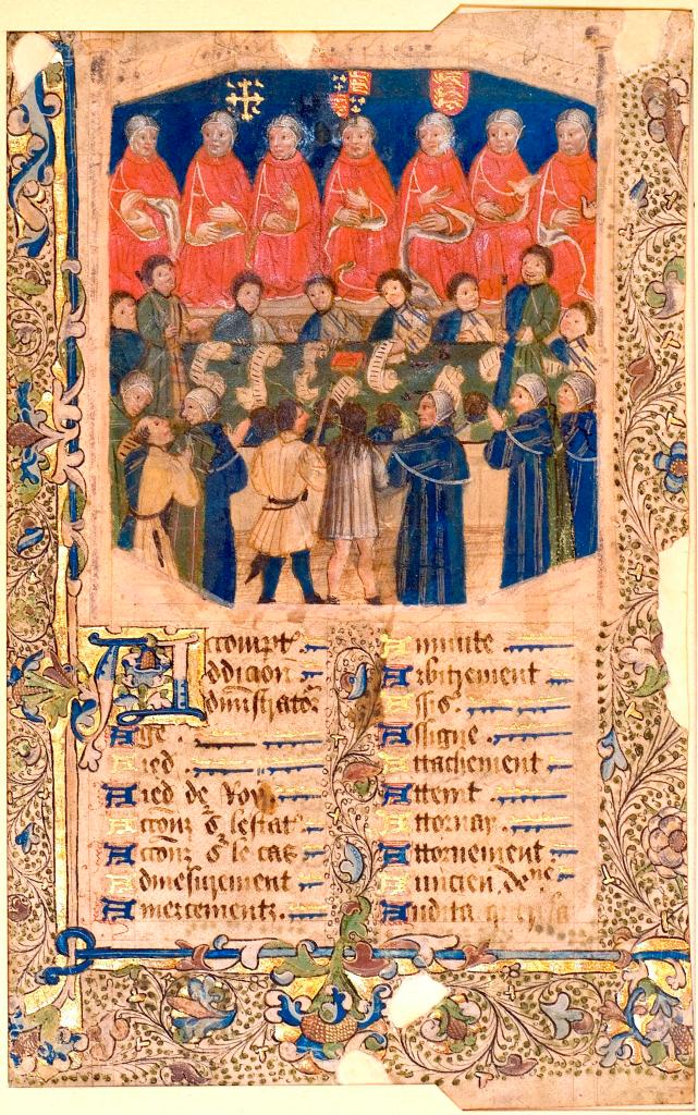 The Court of Common Pleas at work. The image shows pleaders and clients standing in front of seven Justices, and below them, their clerks. Public Domain. Wikipedia.